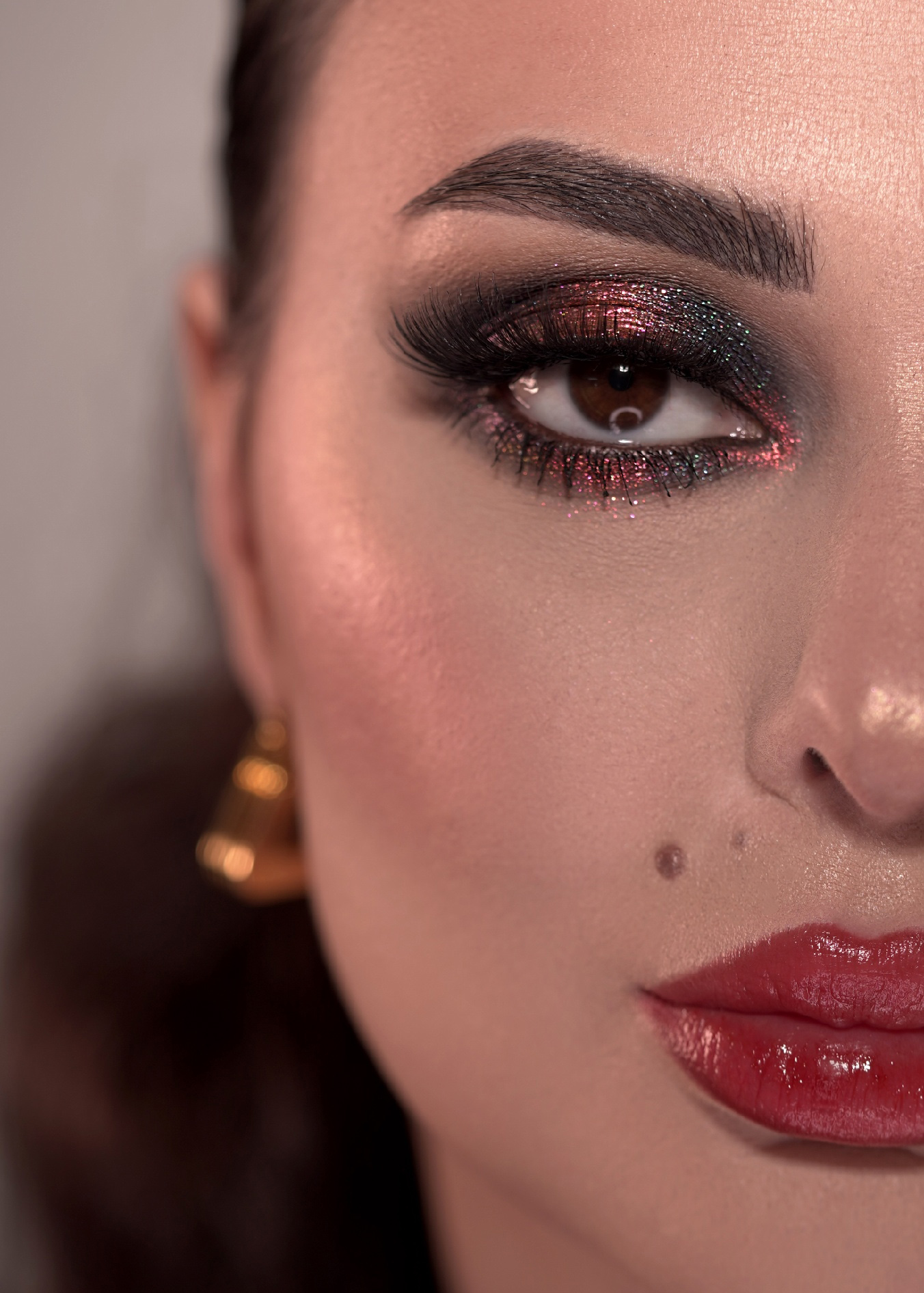 Макияж выполнен с использованием следующих оттенков: - Лепестки пиона (артикул 125); - Дочь солнца (артикул 088); - Владычица зари (артикул 008). Все оттенки нанесены нанесены на липкую базу.